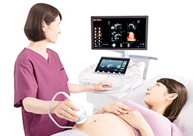 - 妊娠初期、中期、後期の週数それぞれの時期に合わせて、おかあさんとおなかの 中のあかちゃんを共に評価していきます。